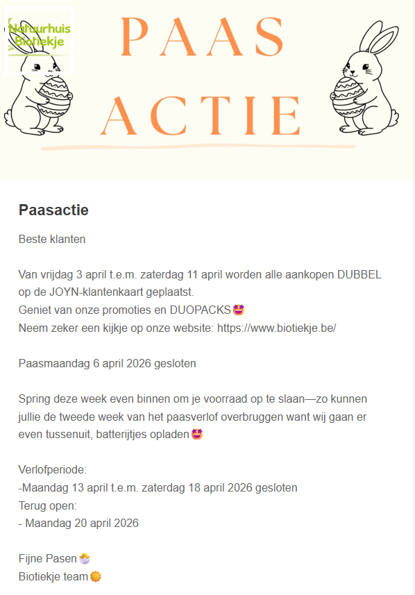 Bestellen kan vooraf, telefonisch 056 60 31 64 of via mail info@biotiekje.be