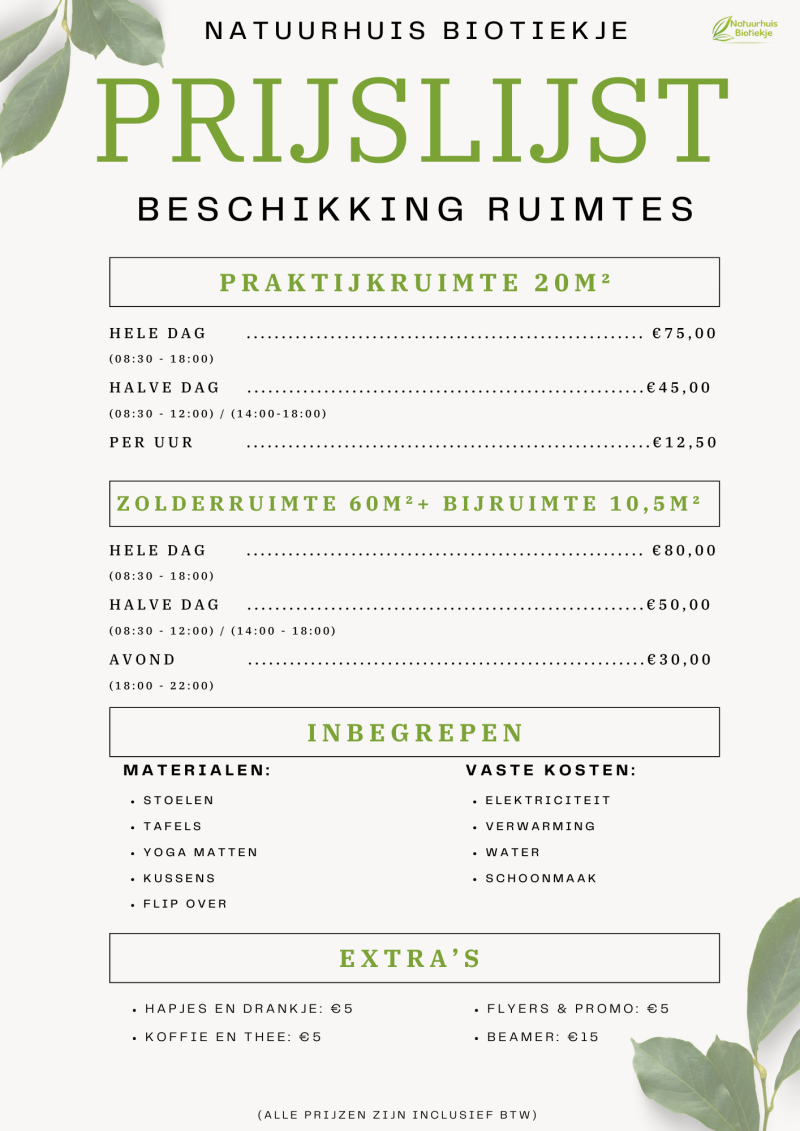 Ben je op zoek naar de perfecte ruimte voor jouw event, vergadering of workshop? Goed nieuws! Onze prijslijst is beschikbaar, zodat je direct weet waar je aan toe bent. ✅