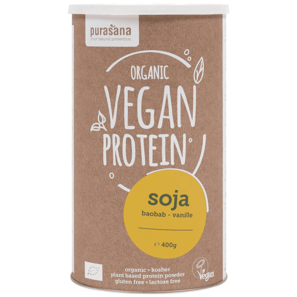 Van alle plantaardige eiwitpoeders, beschikt soja over het hoogste eiwitgehalte. Purasana vegan proteïne poeder soja met baobab/vanille soja bestaat voor 70% uit eiwitten. Het heeft een uitgebalanceerd aminozurenprofiel en een zeer laag vetgehalte. Daarnaast bevat het een hoog gehalte aan L-Glutamine wat belangrijk is bij de spieropbouw.