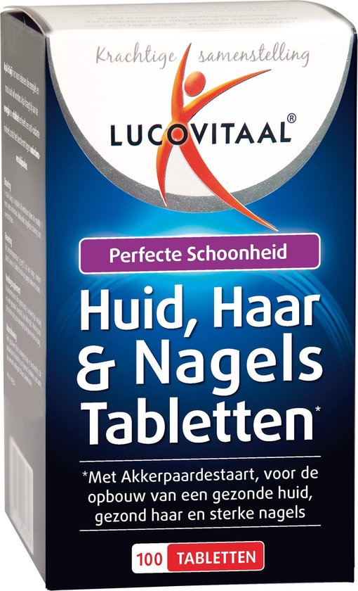 Huid, Haar & Nagels Tabletten van Lucovitaal® bevat o.a. akkerpaardestaart en zink: goed voor de nagels en voor het behoud van een normale huid en glanzend haar. Daarnaast bevatten deze tabletten een combinatie van vitaminen, zoals vitamine B complex, jodium, calcium en magnesium.